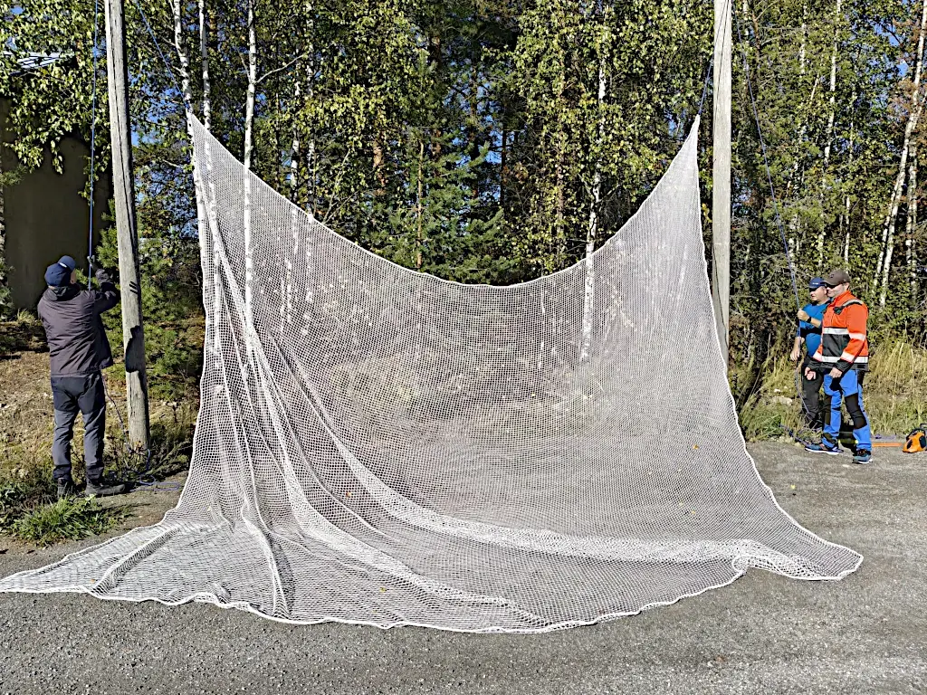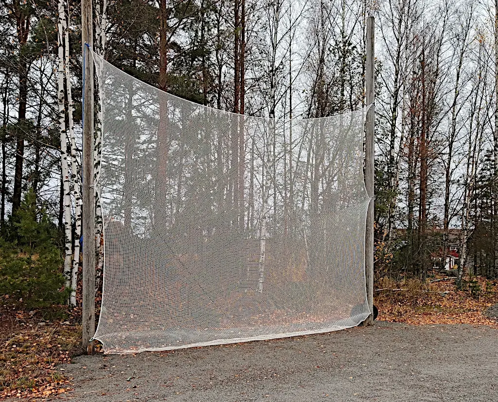 Syyskuussa 2025 hankittiin mittatilauksena sopivan kokoinen verkko ja se vedettiin paikalleen naruilla (helppo asennus ja purkaminen syksyllä).