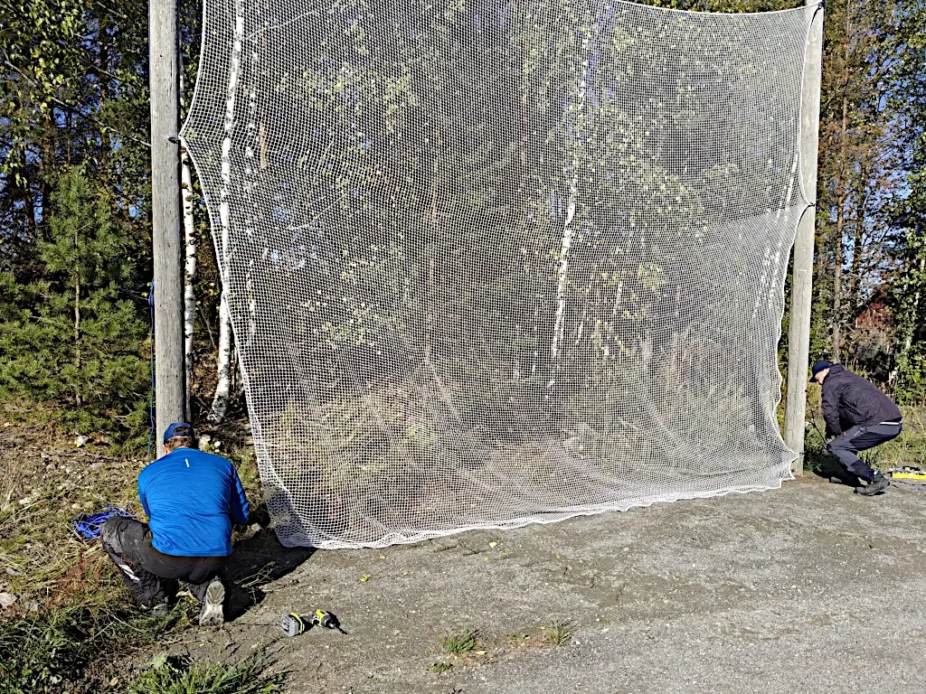 Verkko pingotettiin pylväiden väliin ja kiinnitettiin sakkeleilla pylväisiin.